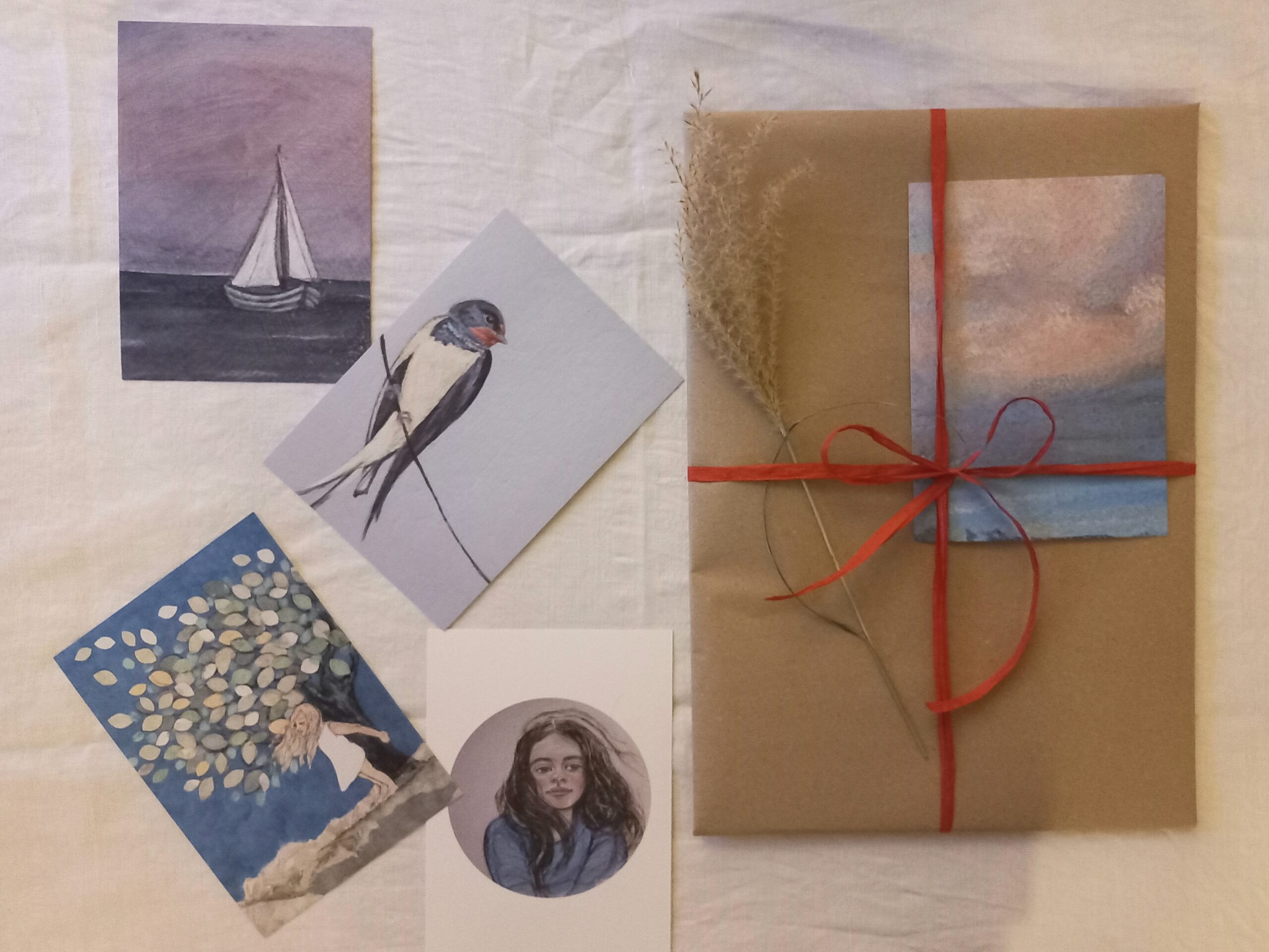 Ein Kunstwerk aus dem Atelier Mabellevie wird von mir mit Liebe eingepackt. Kleine Schätze aus dem Garten, wie getrocknete Gräser oder selbst gefaltete Kraniche aus Papier schmücken das eingepackte Kunstwerk. Ich mag den Gedanken sehr, dass das Auspacken von Ihnen mit viel Freude zelebriert werden kann.