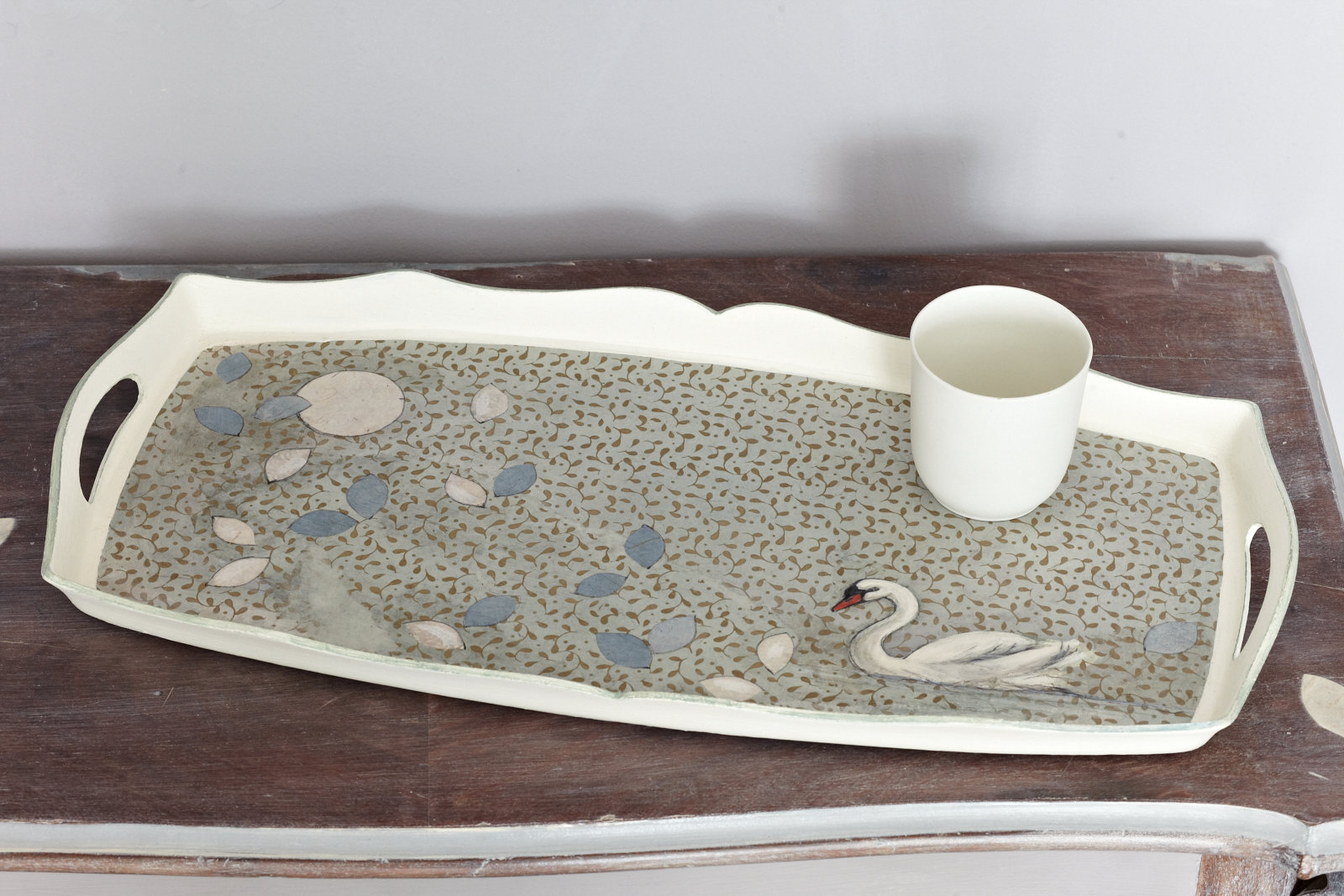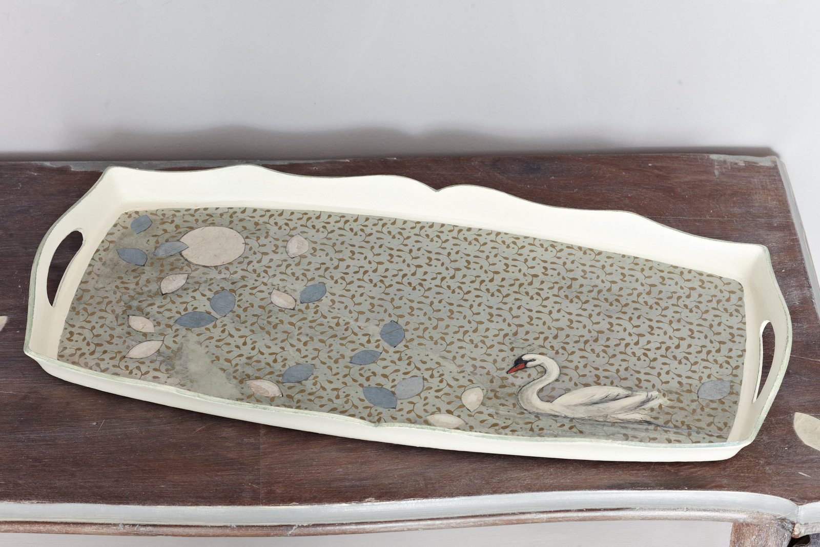 Dieses alte Tablett ist so zart und leicht gestaltet, wie es sich seine Form mit dem sanften Schwung gewünscht hat. Ein weiches handgeschöpftes Papier liegt der Gestaltung zugrunde, auf dem Blütenblätter und ein Schwan unter einem großen runden Mond tanzen. Dieses neugestaltete Tablett ist mit einem matten Lack auf Wasserbasis versiegelt, so dass Sie Ihr Lieblingsporzellan damit wunderbar tragen können. Ich empfehle jedoch, keine heißen oder nassen Dinge damit zu transportieren, damit Sie ein Leben lang Freude an Ihrem Kunstwerk haben können.