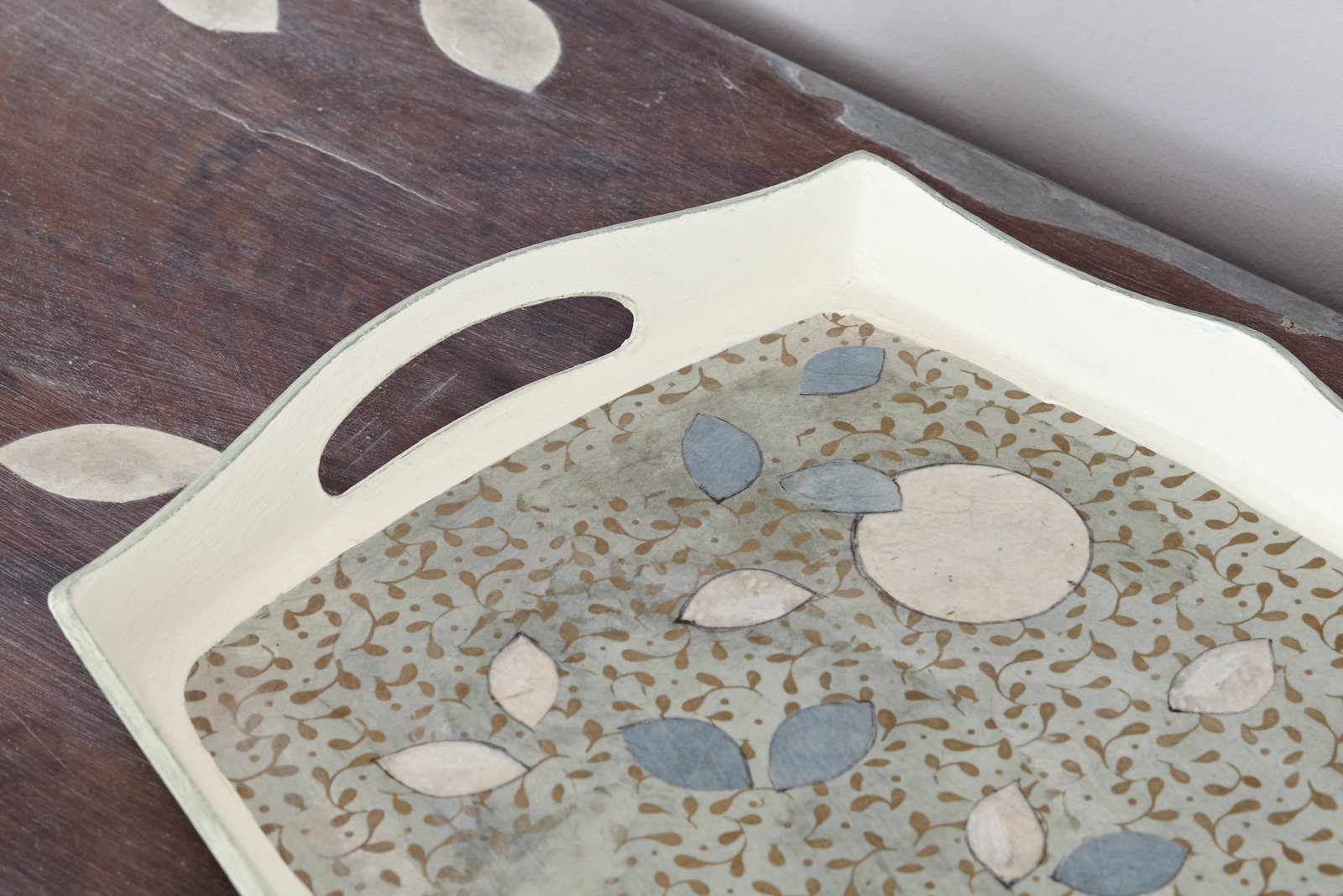 Altes Tablett – Kreidefarbe, Zeichnung und Collage –mit einem matten Lack auf Wasserbasis versiegelt