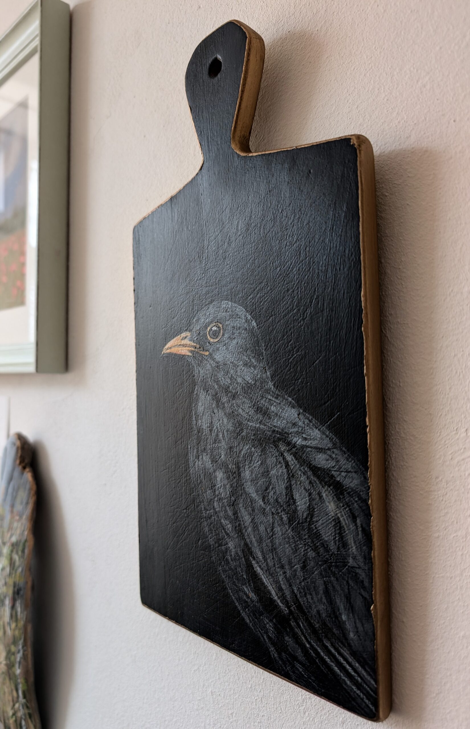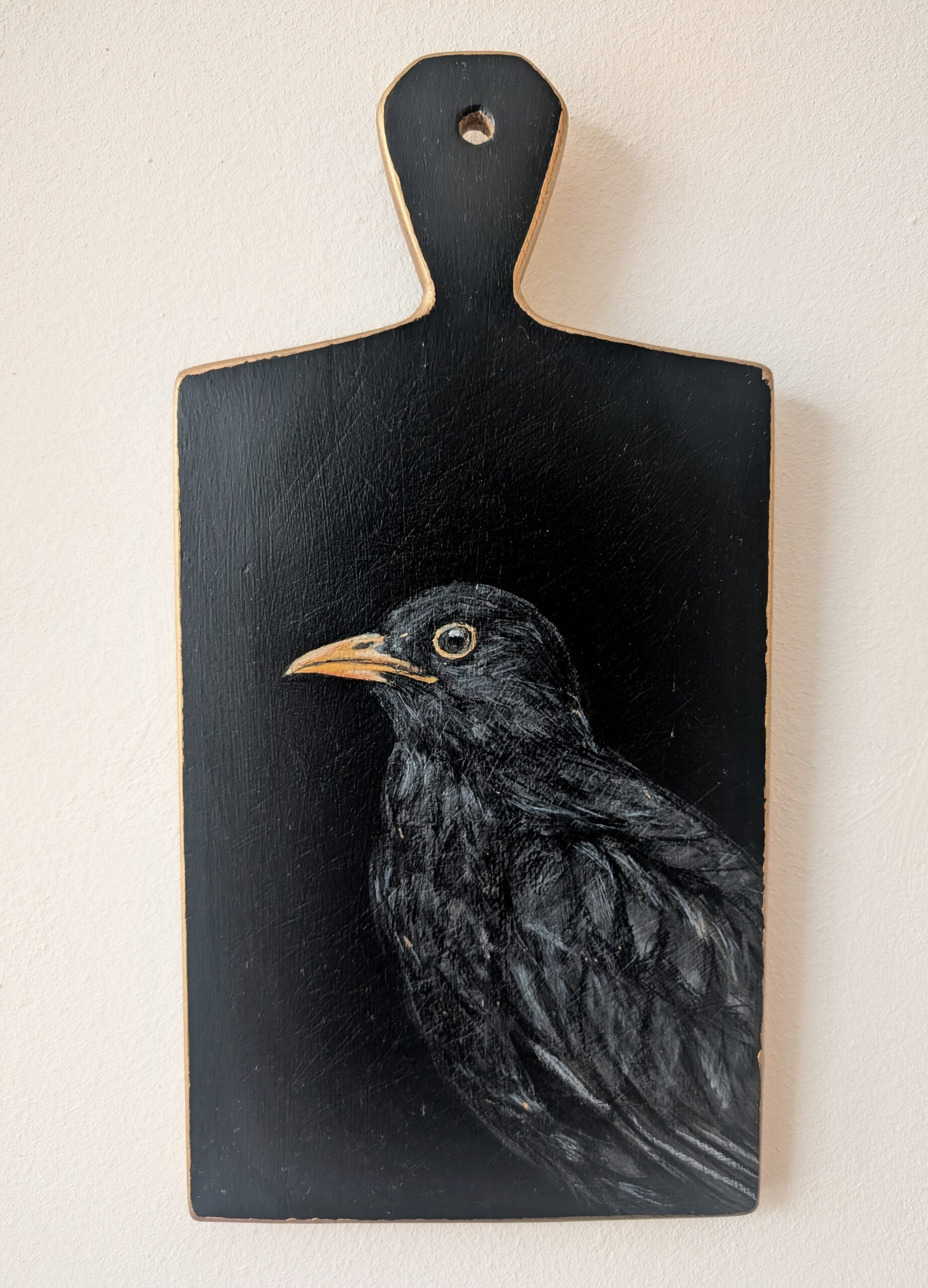 Dieses Amselportrait auf nachtschwarzem Kreidegrund habe ich auf einem alten Holzbrettchen gemalt. Es lässt uns vom feinen Gesang der Spätwinteramsel in der Dämmerung träumen…und erinnert uns daran, dass jeder Nacht ein Morgen folgt und jedem Winter ein Frühling. Vielversprechend und warm leuchtet das Gold auf den Holzkanten dieses Kunstwerkes.