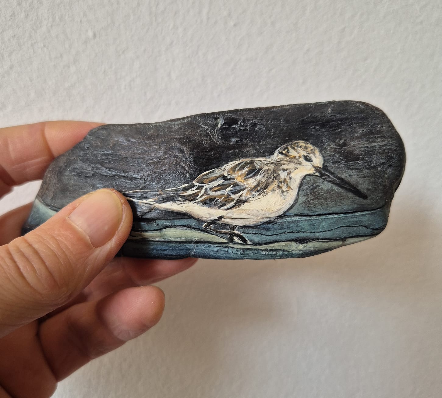 Dieses wunderschöne kleine Treibholz habe ich an einem Ostseestrand gefunden. Die vorhandenen Linien und der dunkle Ton des Holzes haben mich zu dem verträumten kleinen Strandläufer inspiriert, der nun durch seichtes Wasser watet. Auch dieses besondere Stück hat neben seiner Signatur eine Aufhängung an der Rückseite und wird in sein neues Zuhause den Duft des Meeres und das Rauschen des Windes mitbringen.