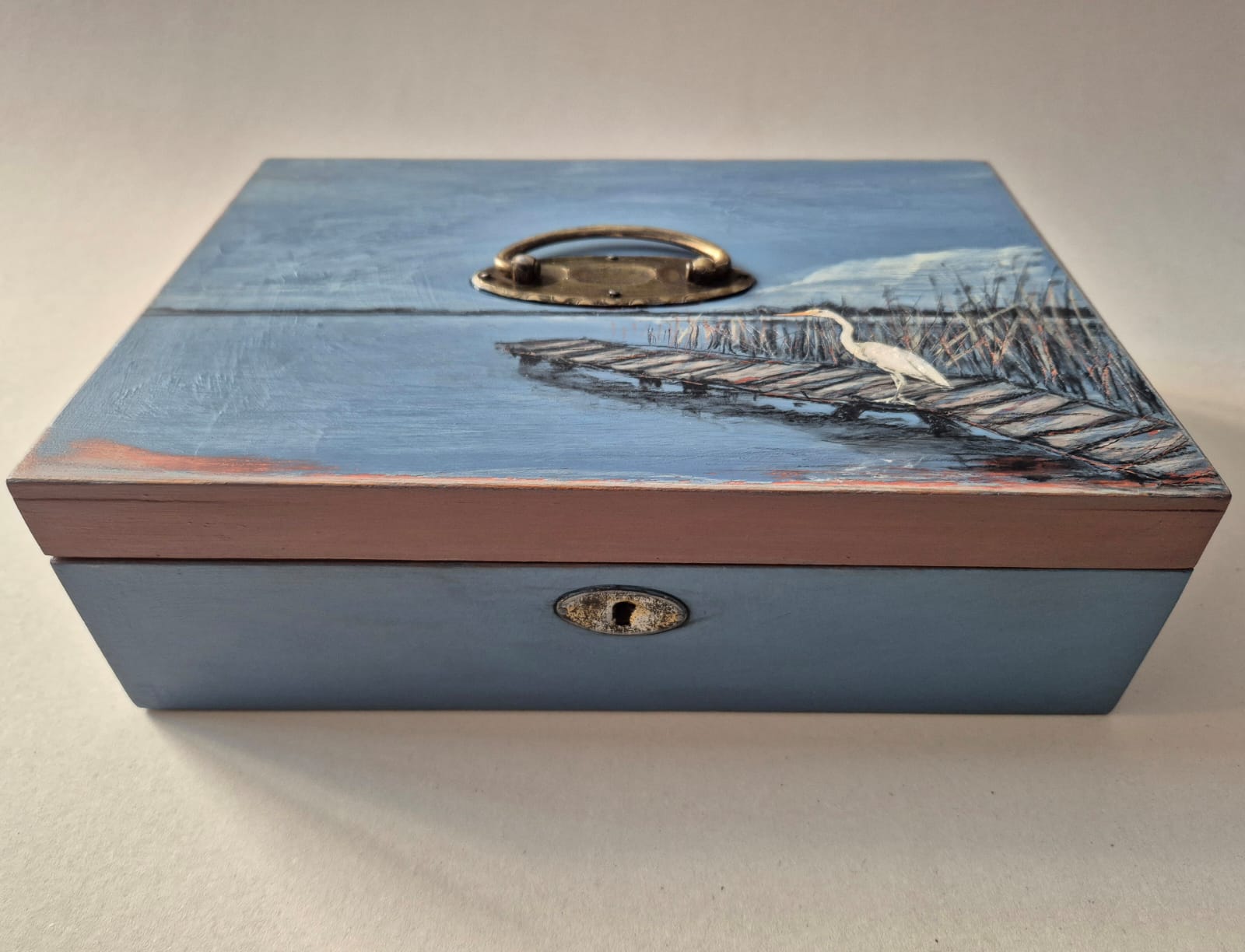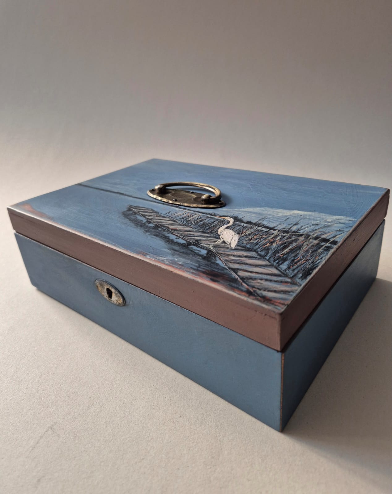 Dieses alte Schatzkistchen leuchtet uns in schönstem Blau entgegen. Leicht schimmert in den Ecken ein ursprünglicher Farbton hindurch und ein weißer Vogel steht still und wachsam am See… als würde er all die Schätze, die in der Tiefe verborgen liegen behüten. Diese Kiste ist innen mit handgeschöpften Papieren ausgekleidet und wird Ihren ganz persönlichen Schätzen ein liebevolles und einzigartiges Zuhause schenken.